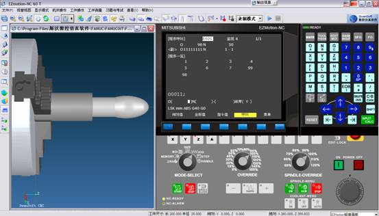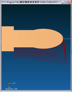 1.加工程序 O1111 N010T0101 N20M03S800 N030G00X70Z5 N040G73U25R5 N050G73P60Q120U1F200 N060G01X0Z0 N070#100=40 N080#101=20*SQRT[1-#100*#100/1600] N090#100=#100-1 N100G01X[2*#101]Z[#100-40] N110IF[#100GT-20]GOTO80 N120G01Z-100 N130G70P60Q120 N140M30 N150 N110 % 2.生成二维的加工轨迹线 3.三维加工图形
